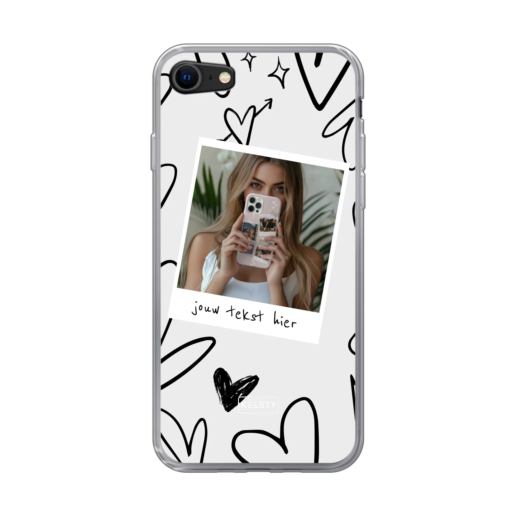 Maak van je telefoon een persoonlijke eyecatcher met dit unieke telefoonhoesje in Polaroid-stijl. Voeg een eigen foto toe in het herkenbare retro-frame, schrijf je eigen tekst onder de foto én kies een achtergrond vol speelse hartjes in jouw favoriete kleur.
