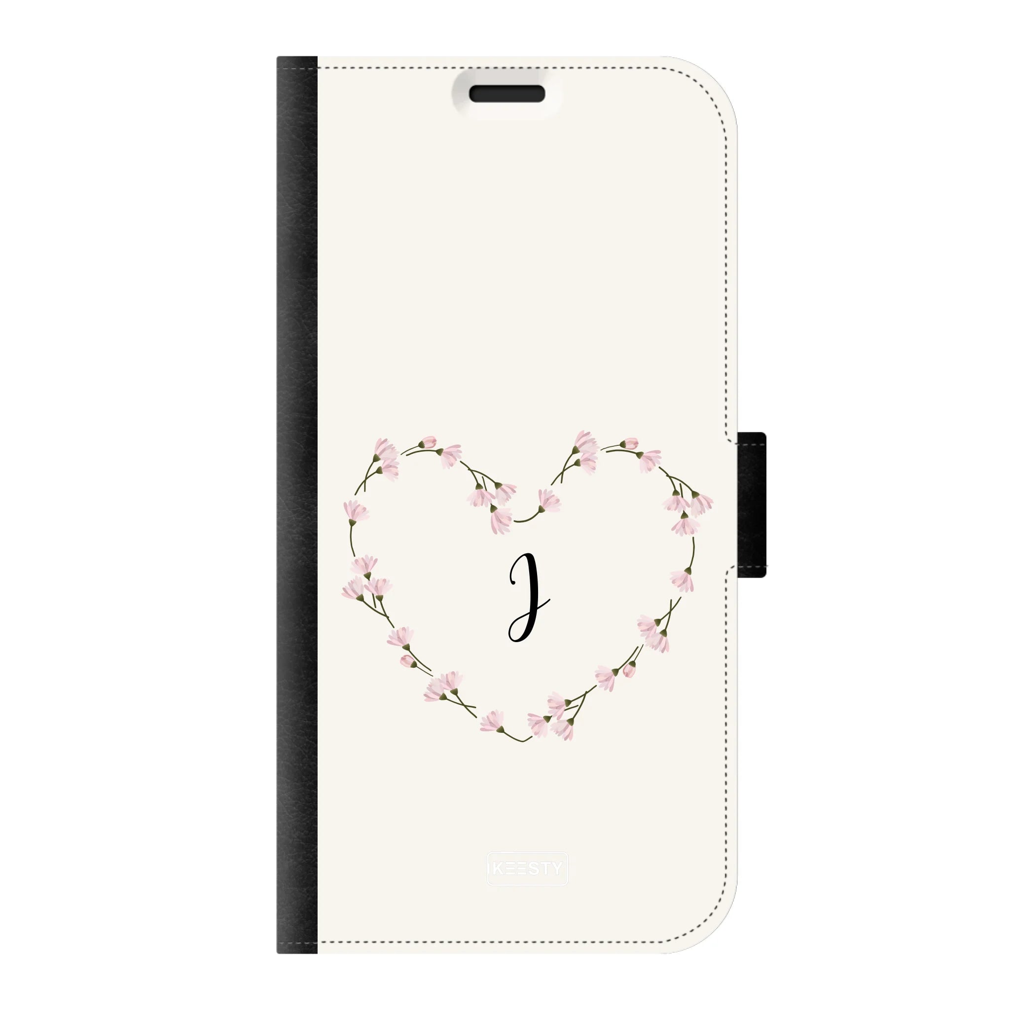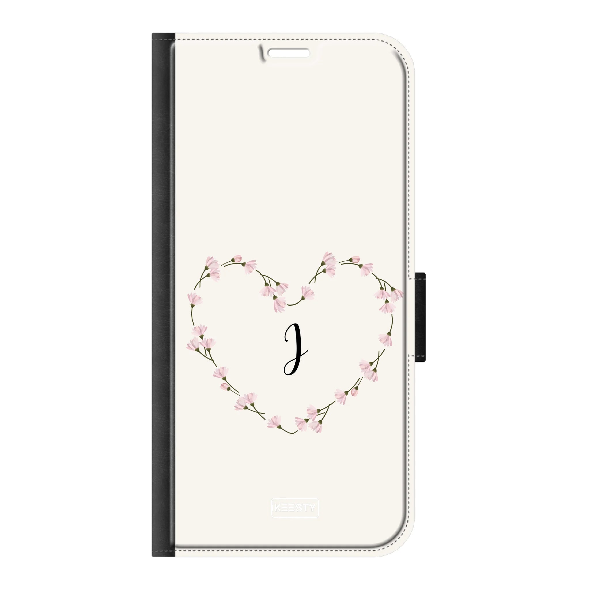 Combineer gemak, bescherming en een persoonlijk ontwerp met dit portemonnee hoesje met bloemenprint en eigen tekst. De voorkant is bedrukt met een romantisch bloemen hartje waarin je jouw naam, quote of datum kunt laten zetten. De achterkant en zijkanten zijn stijlvol zwart, wat zorgt voor een rustige en elegante uitstraling.